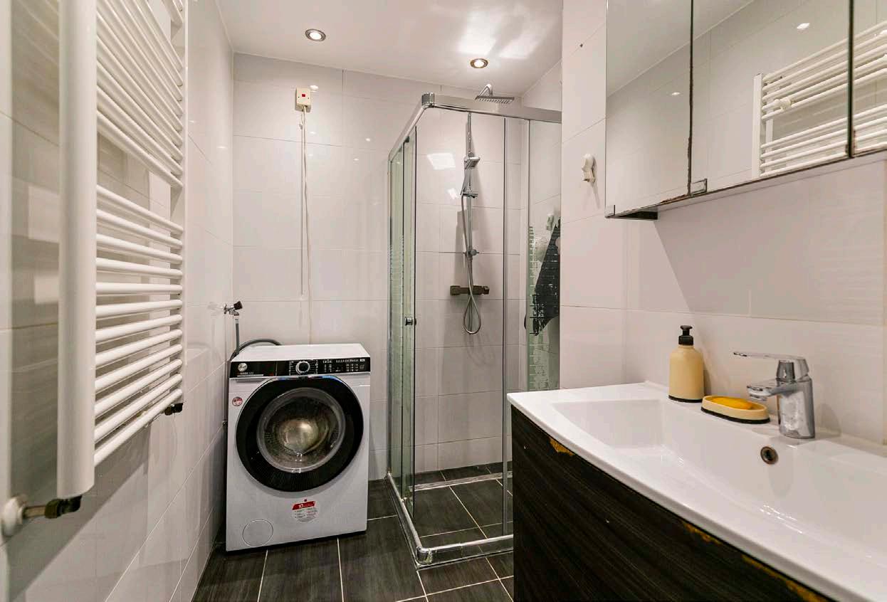 De goed onderhouden badkamer is uitgerust met alle benodigde apparaten en biedt een eigentijdse uitstraling.