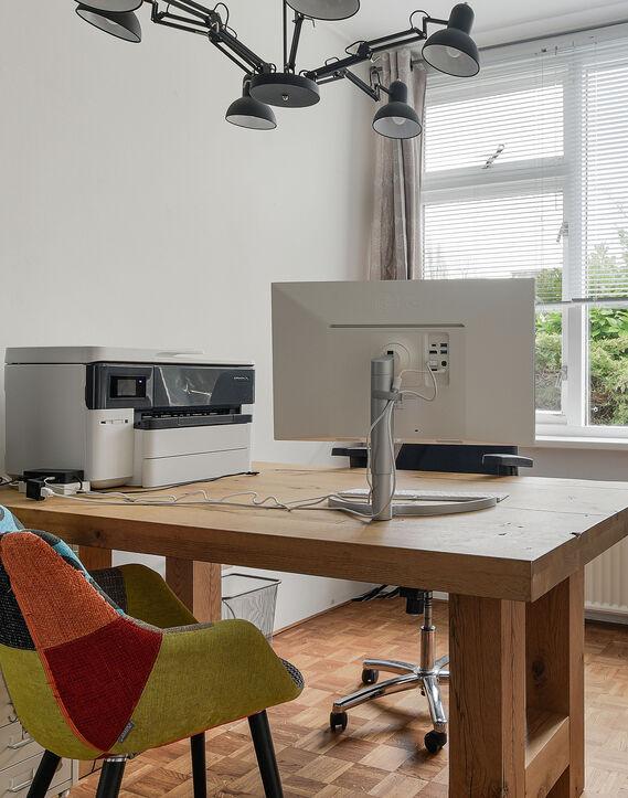 The deep living room feels very light due to the many windows and is clearly divided into a dining area and sitting area with fireplace. The patio is an extension of this living space and at the rear you can enjoy and overlook the wide park.