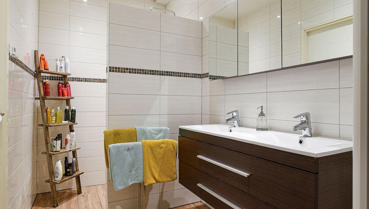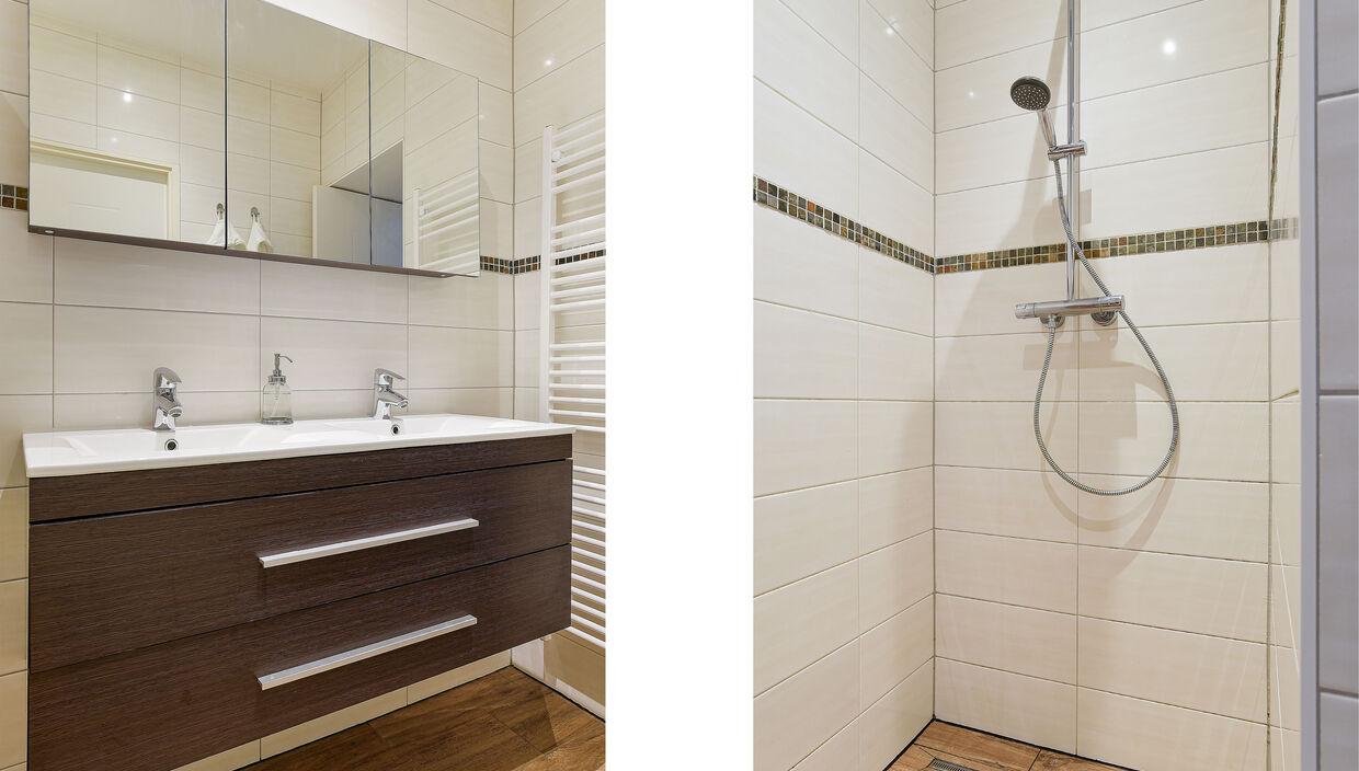 Moderne badkamer met een inloopdouche met drain, wastafelmeubel met dubbele wastafel, spiegelkast en handdoekradiator.