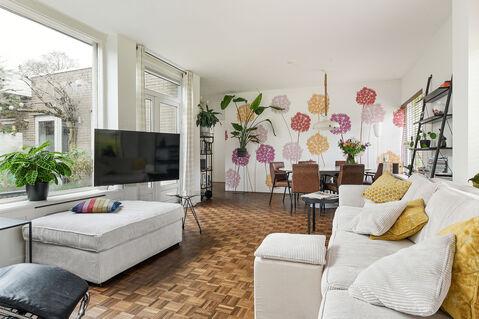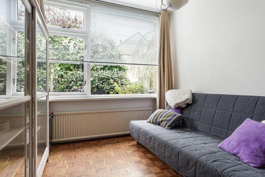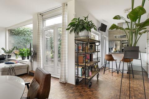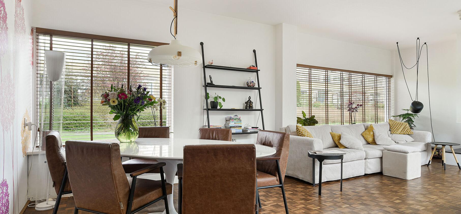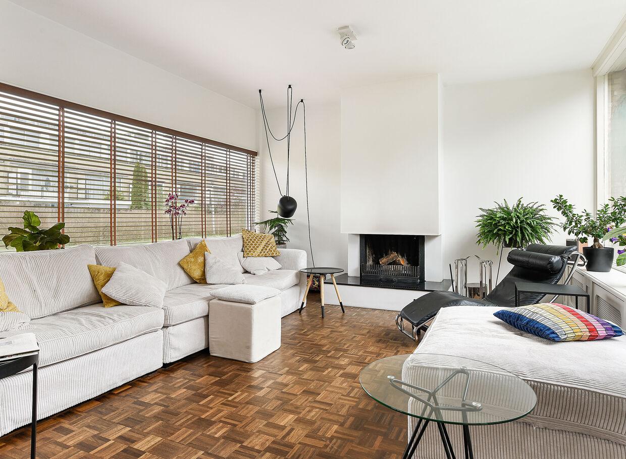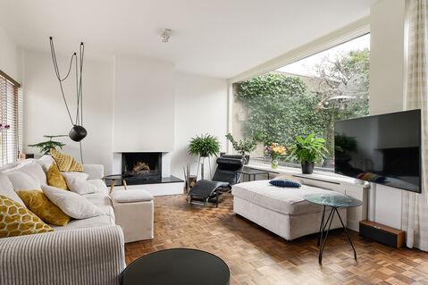 De diepe woonkamer voelt zeer licht door de vele kozijnen en is duidelijk ingedeeld in een eethoek en zitgedeelte met openhaard. De patio is absoluut een verlengde van deze verblijfsruimte en aan de achterzijde kijkt u prettig weg op het brede plantsoen.