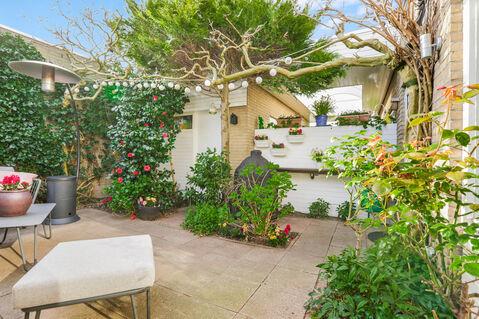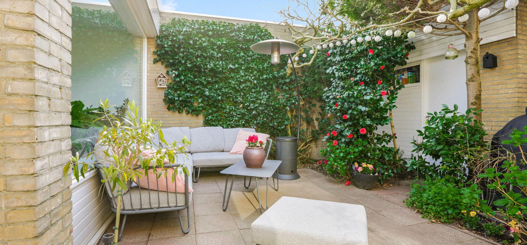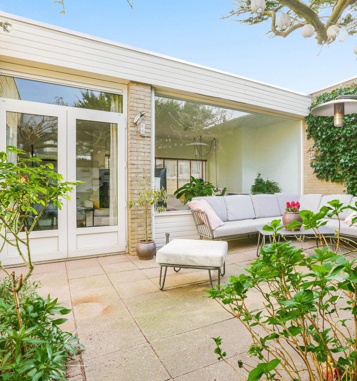 This attractive patio forms the core of the house. Since the temperature here quickly becomes pleasant and there is hardly any wind, this really feels like an extension of the daily living space and is an absolute added value of the house. The patio is also equipped with a lot of permanent green plants and mood lighting.