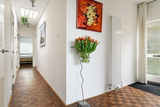 We approach the entrance of the house covered under a roof. From here you also have access to the garage and the very atmospheric patio. After entrance a L-shaped hall connects all rooms of the house. A beautiful (block) parquet floor ensures that all rooms flow organically into each other.