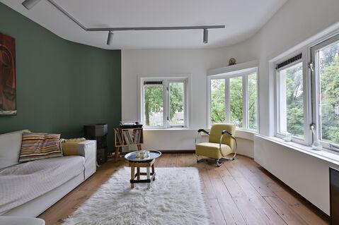 The property has been uniquely renovated under architecture and features a charming finish. On the first floor, there is a spacious living room on the (round) corner, with many windows allowing for ample natural light and expansive views of the greenery.