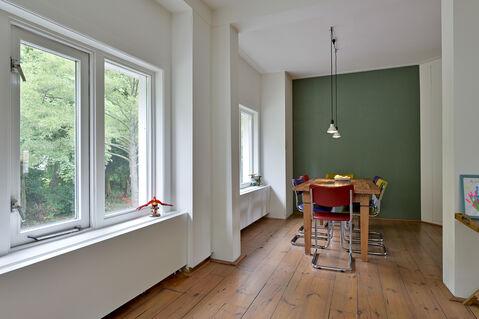 De woning is op een bijzondere manier, onder architectuur gerenoveerd en beschikt over een sfeervolle afwerking. Op de eerste verdieping bevindt zich een ruime woonkamer op de (ronde) hoek, met veel ramen waardoor je hier van een fijne lichtinval en een weids uitzicht op het groen geniet.