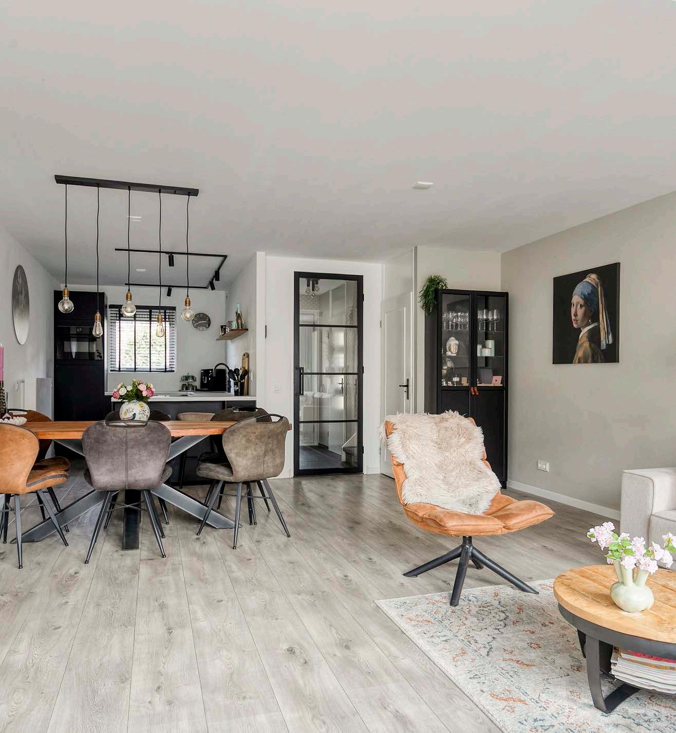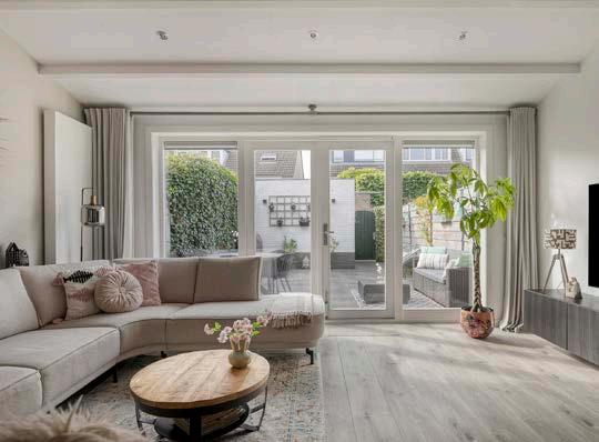 De lichte woonkamer is een fijne plek om tot rust te komen. De grote openslaande deuren verbinden binnen met buiten. De stalen deur naar de hal geeft een moderne en stijlvolle uitstraling aan het geheel.
