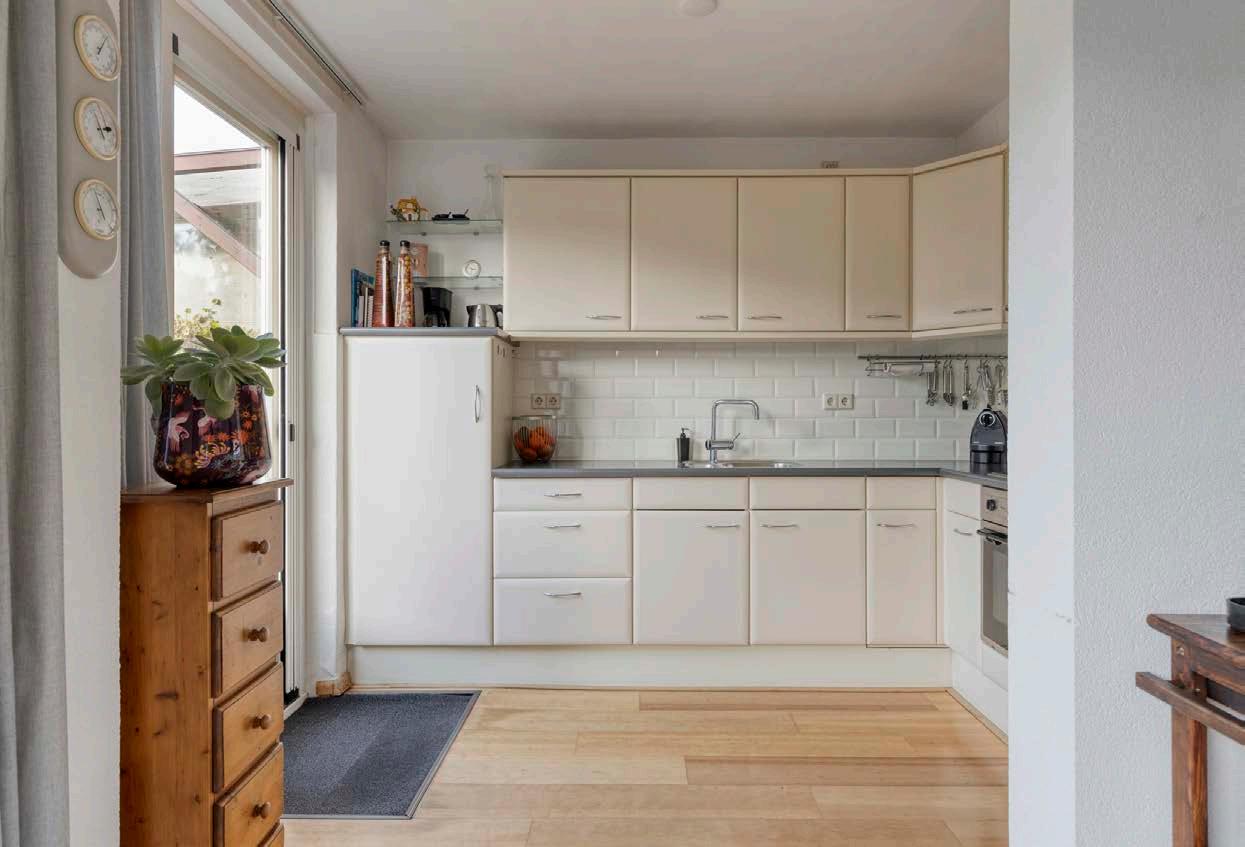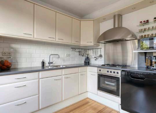 De nette halfopen keuken, opgesteld in een praktische L-opstelling. De doorgebroken indeling creëert een naadloze overgang naar de eetruimte, waardoor koken en samen eten een feestje worden. De keuken is compleet en voorzien van faciliteiten zoals een vaatwasser, koelkast, wazemkap, elektrische oven en een 4-pits gasfornuis, met tevens een handige doorgang naar de tuin.