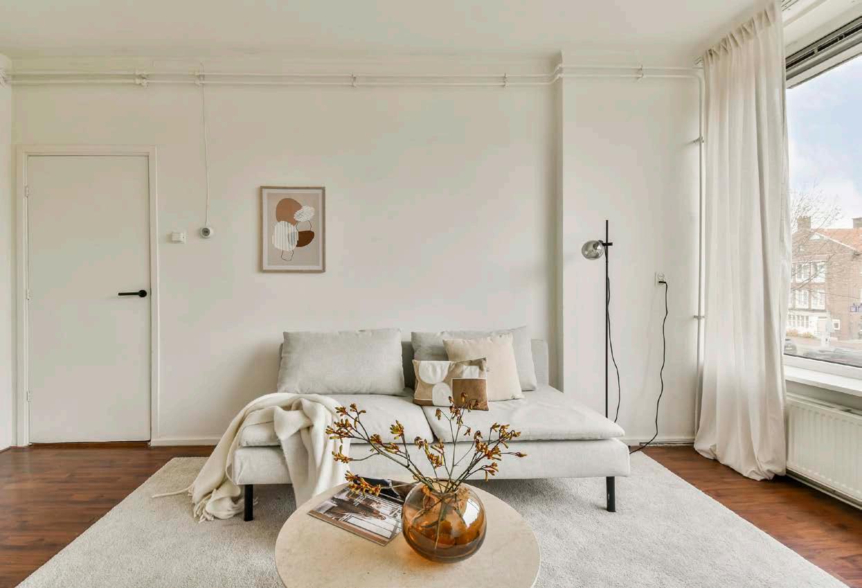 De woonkamer is licht dankzij de grote raampartijen, en de inrichting biedt genoeg ruimte voor zowel een gezellige zithoek als een eettafel. Hier kun je je dag rustig starten met je favoriete ontbijt of ‘s avonds ontspannen na een drukke dag in de stad.