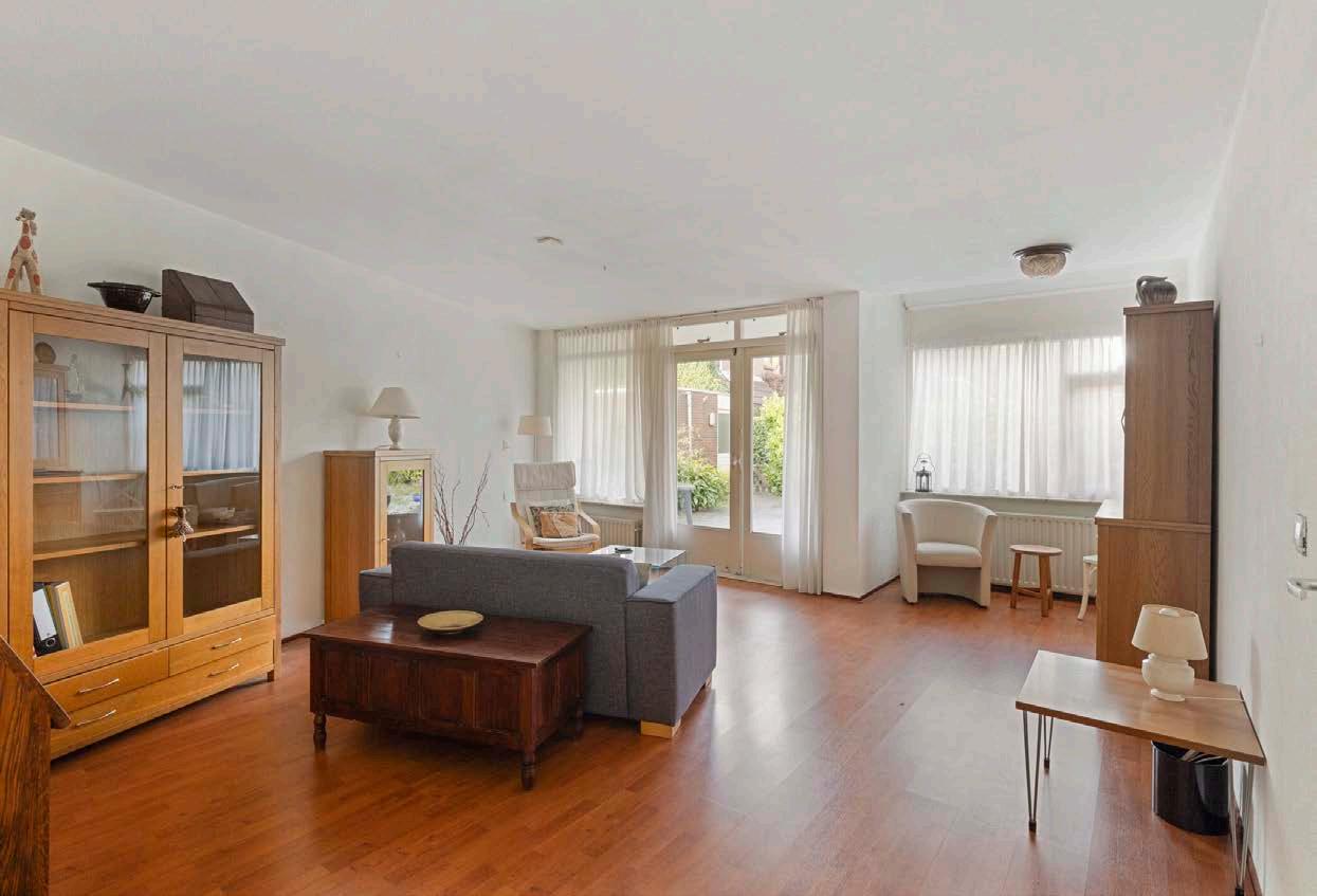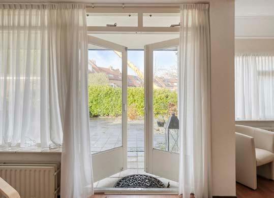 De gezellige woonkamer is gelegen aan de achterzijde van de woning en loopt breed uit richting de grote achtertuin. Via de openslaande deuren is de tuin toegankelijk. Mede door de overkapping kun je heerlijk beschut buiten zitten. In de tuin bevindt zich nog een (fietsen)berging en er is een achterom aanwezig.