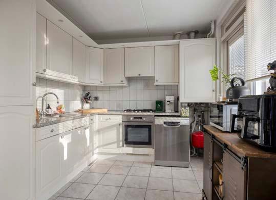 Grenzend aan de woonkamer vind je de keuken. Deze is met zorg ingedeeld en voorzien van een slimme hoekopstelling, waardoor je genoeg werken opbergruimte hebt. De keuken is uitgerust met diverse inbouwapparatuur, waaronder een gaskookplaat, koelkast, vriezer, oven en voldoende kastjes voor je voorraad en kookgerei. Via de keuken loop je direct de achtertuin in, ideaal voor wanneer je buiten wilt dineren of je kruiden in je eigen tuin kweekt! Via de achtertuin bereik je ook de berging/garage en achterom.