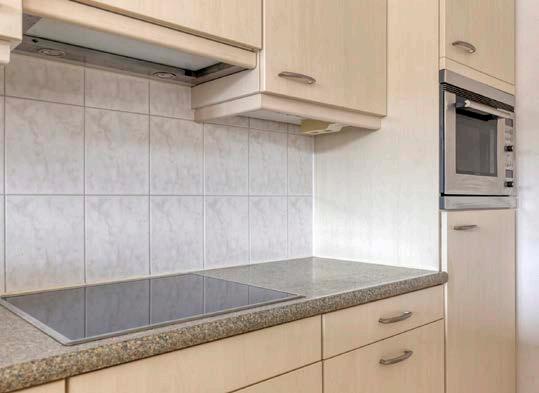 De open keuken is voorzien van diverse inbouwapparatuur waaronder een vaatwasser, koelkast, combi magnetron, inductie kookplaat en afzuigkap.