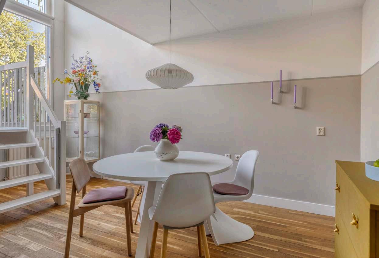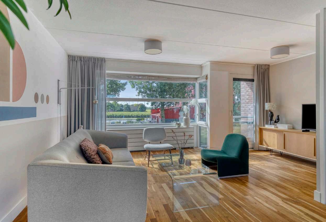 Ga je een verdieping hoger, dan kom je in de woonkamer van maar liefst 36 m². Het voelt direct luchtig en ruim, mede door de grote raampartijen die zorgen voor een zee van daglicht. Terwijl je ontspannen een boek leest op de bank geniet je van een prachtig vrij uitzicht op de omliggende vaart. De eikenhouten vloer voegt warmte toe, terwijl de indeling ruimte biedt voor jouw persoonlijke woonstijl.
