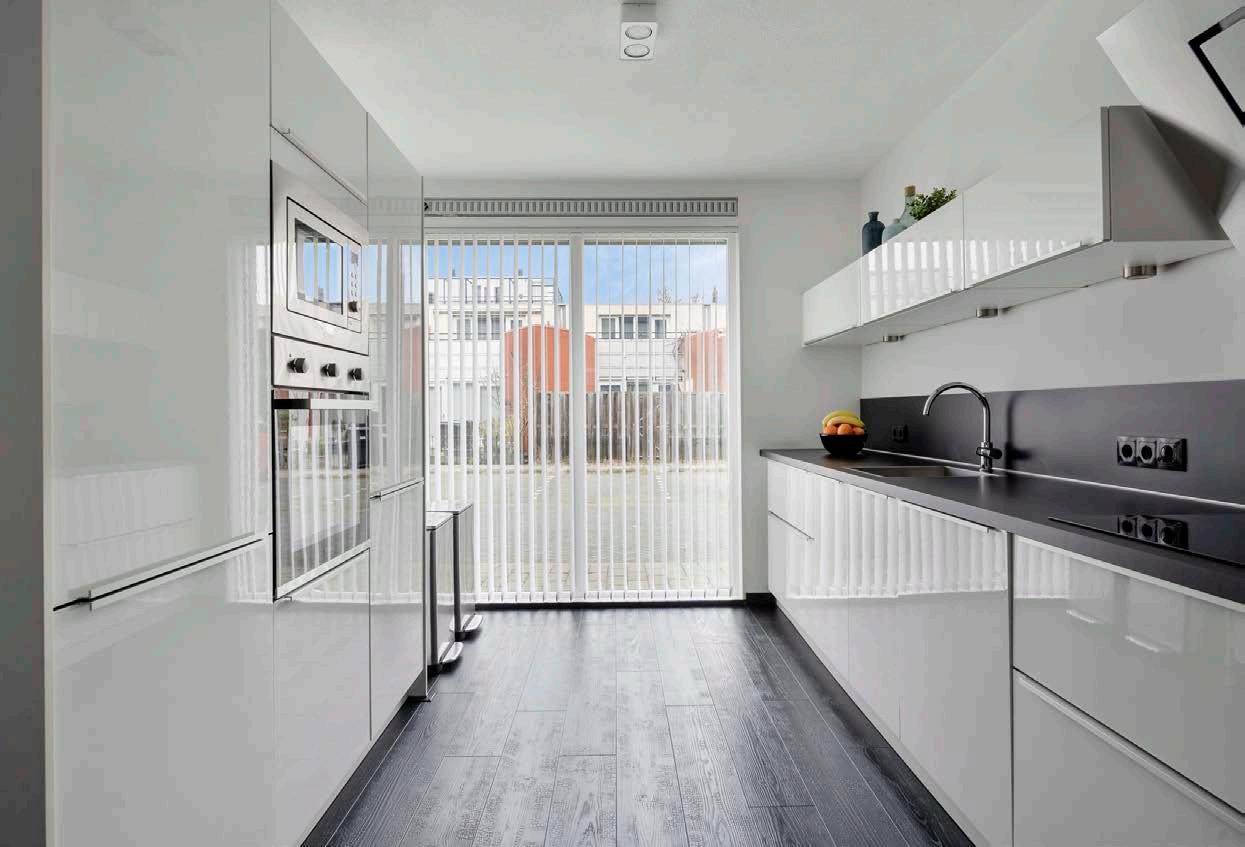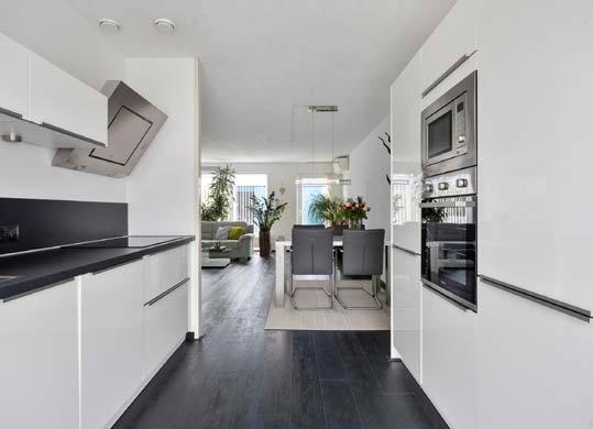 Aan de voorzijde van de woning vind je de strakke keuken, die naast zijn eigentijdse uitstraling ook praktisch is ingericht. Hier wordt koken weer genieten: twee koel-/vriescombinaties naast elkaar, een oven, een combimagnetron, een vaatwasser, een vierpits inductiekookplaat én een 10-liter boiler zorgen ervoor dat je met gemak de lekkerste gerechten op tafel tovert.
