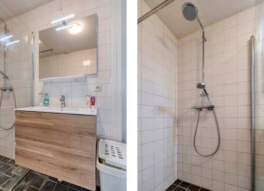 De badkamer is strak en modern ingericht, met een ruime inloopdouche en een stijlvol badkamermeubel dat volop opbergruimte biedt. Het aparte toilet is een extra gemak dat zeker gewaardeerd wordt.