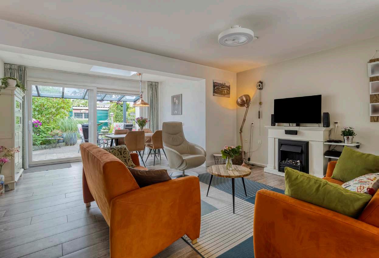 De tuingerichte woonkamer is een fijne, lichte ruimte dankzij de brede achterpui en een extra lichtkoepel in de uitbouw. De nette afwerking en de prettige indeling maken dit een heerlijke plek om te ontspannen of gezellig samen te zijn. Via de schuifpui stap je zo de tuin in.