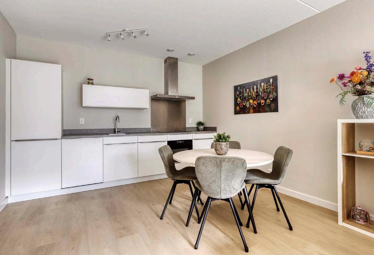 De moderne keuken is langs één wand opgesteld en voorzien van diverse inbouwapparatuur, waaronder een inductiekookplaat, afzuigkap, wastafel, vaatwasser, combimagnetron en een koel-/vriescombinatie. Er is een verlengde garantie op de keuken (+8 jaar).