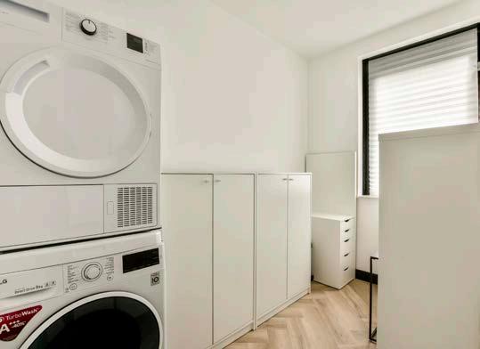 Op de eerste verdieping tref je drie kamers, allemaal met hun eigen functionaliteit en charme. De twee ruime slaapkamers zijn ideaal voor een master bedroom en een kinderkamer, logeerkamer of thuiskantoor. Door de strakke vloerafwerking die overal doorloopt, voelt deze verdieping als een geheel. De derde kamer geeft je een praktische oplossing voor was- en bergruimte. De comfortabele badkamer sluit hier perfect op aan, compleet uitgerust met een wastafelmeubel, een moderne inloopdouche en een tweede toilet.