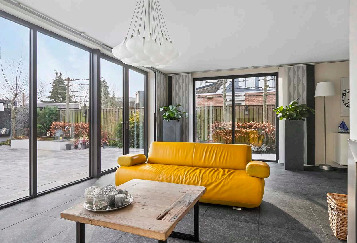 De tuingerichte woonkamer is dé plek waar je samenkomt. De brede glazen pui zorgt niet alleen voor een prachtige lichtinval, maar ook voor zicht op de achtertuin, die werkelijk een oase van rust is. Hier krijg je het gevoel van ruimte en luxe, of je nu binnen op de bank zit, of in de tuin geniet van het zonneterras en het geluid van kabbelend water in de vijver.