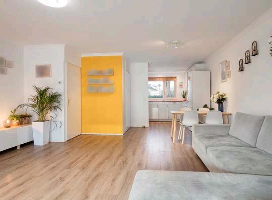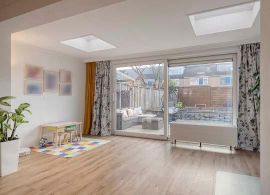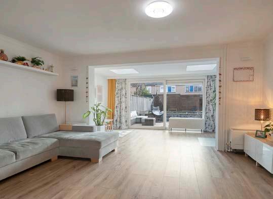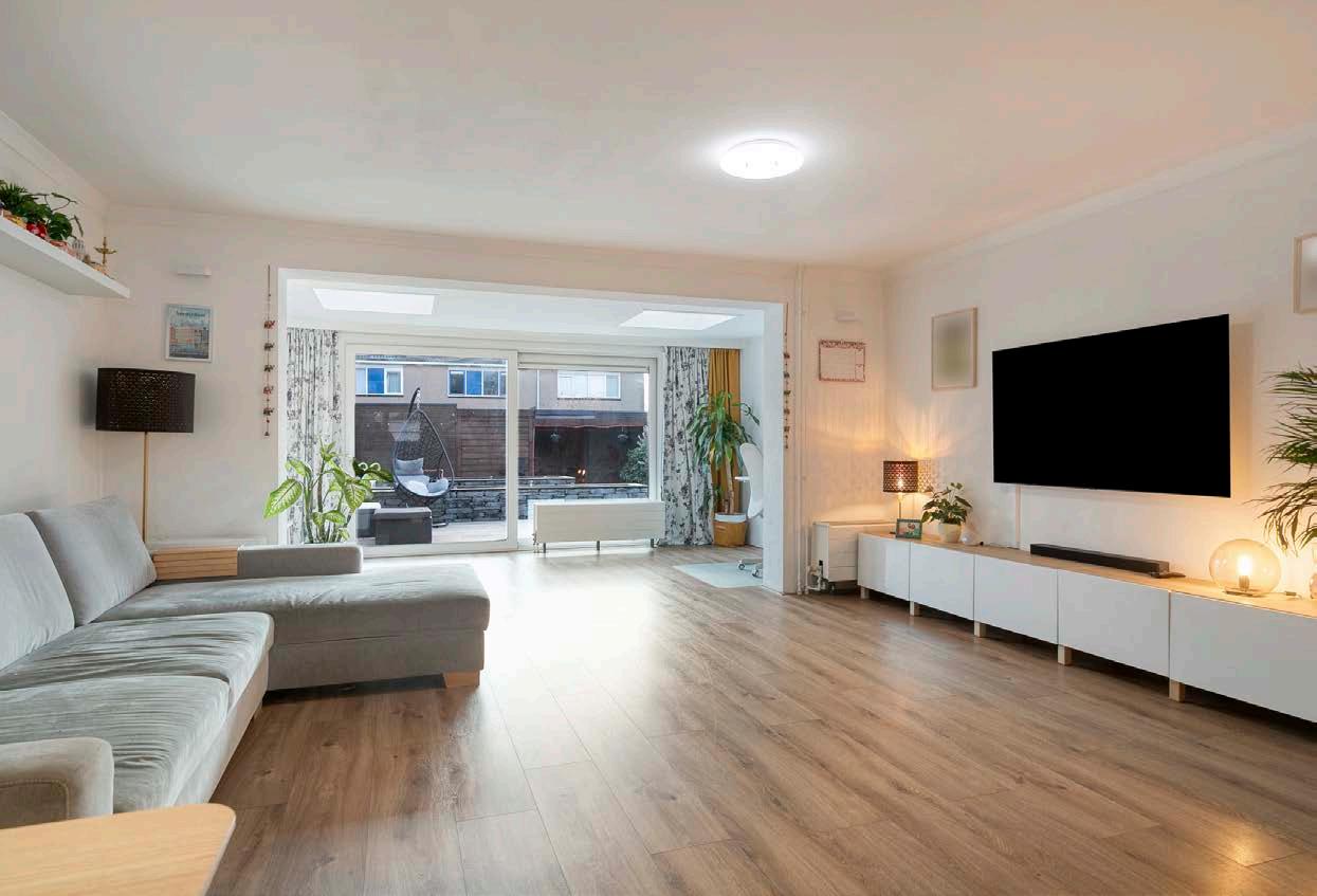 De lichte, ruime woonkamer. De uitbouw met 2 grote dakramen zorgt voor een royale en lichte leefruimte, ideaal voor gezellige avonden met familie of vrienden. Het grote raam en de tuindeur naar buiten brengen natuurlijk licht naar binnen en trekken je blik meteen naar de groene achtertuin.