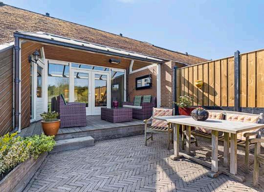 Ook de buitenruimte laat niets te wensen over. De achtertuin is prachtig aangelegd met een veranda en een fijn terras aan het water. Stel je voor: de warme zon op je huid, het zachte geruis van de wateren, en een weids uitzicht dat zelfs de meest kritische zintuigen weet te bekoren. Het is een plek waar je kunnen genieten, tot rust komen en tegelijkertijd volop inspiratie opdoen. Niet alleen de visuele aspecten maken indruk: door de koele zomerse bries en het warme zonlicht in de winter creëert dit huis een sensatie die ontspanning garandeert.