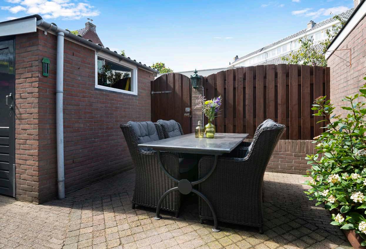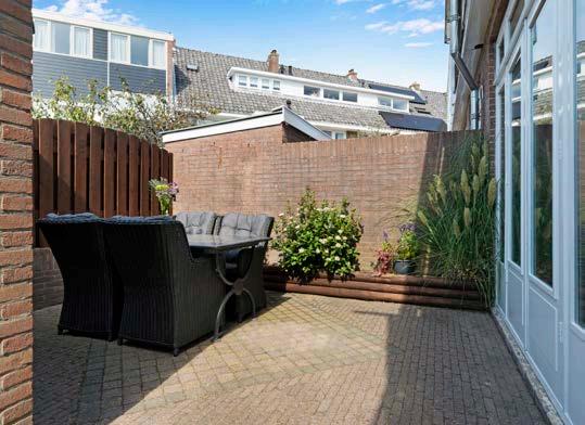 De achtertuin is gelegen op het westen, is volledig bestraat en voorzien van tuinbakken, erfafscheiding aan beide zijden, vrijstaande berging voorzien van elektra en een poort naar de steeg.