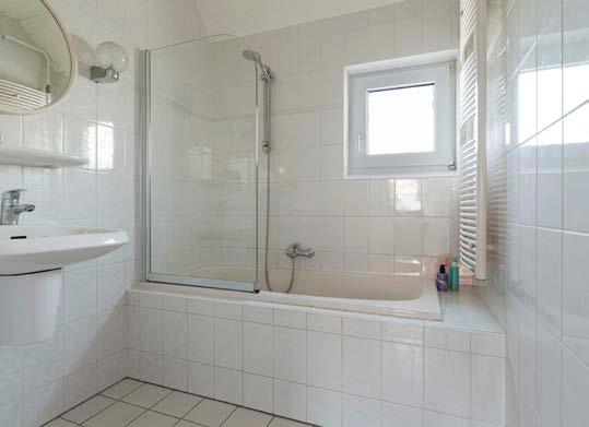 De nette badkamer heeft een ligbad met douchescherm, wastafel, designradiator en een raam voor het licht en de ventilatie. Het kunststof plafond is voorzien van inbouwspots.
