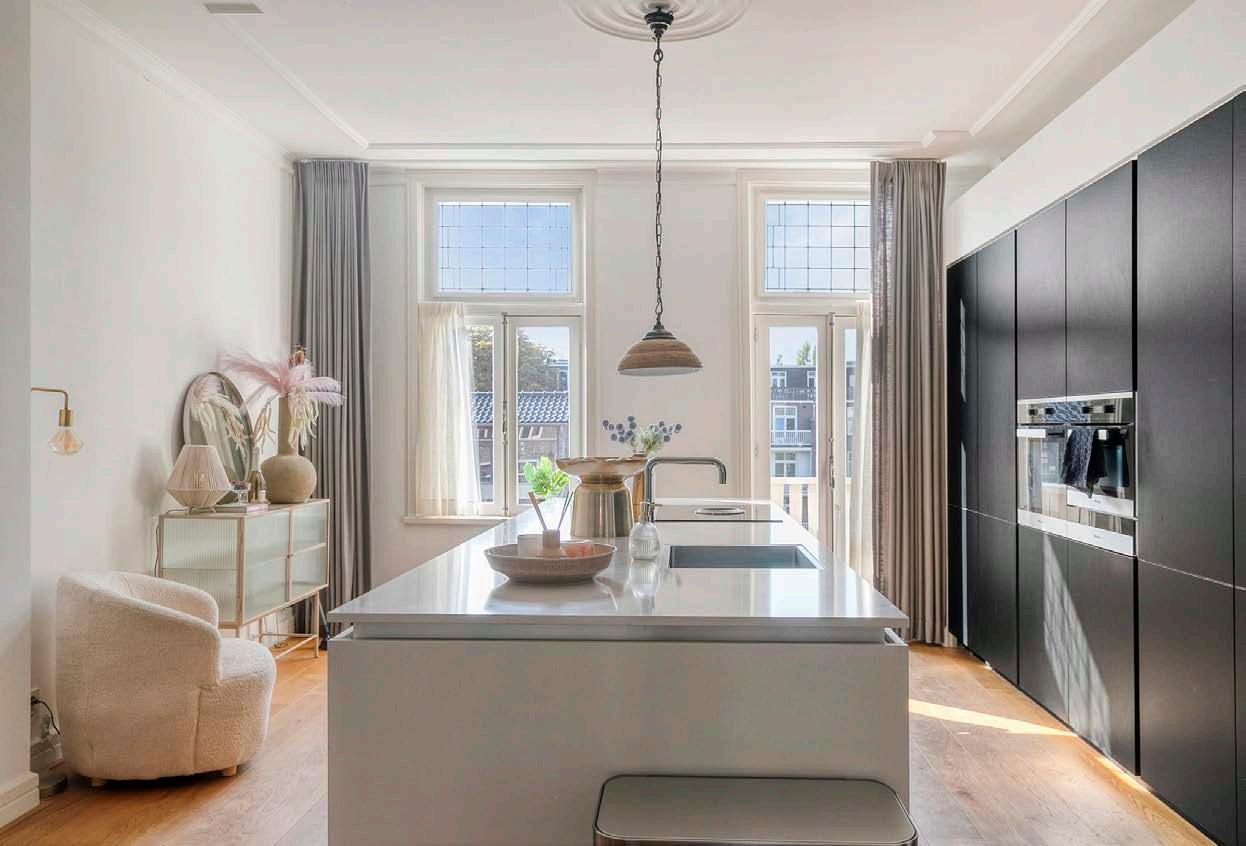 Moderne keuken met inbouwapparatuur en kookeiland aan de achterzijde met toegang tot terras.