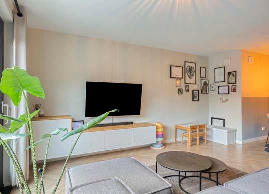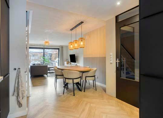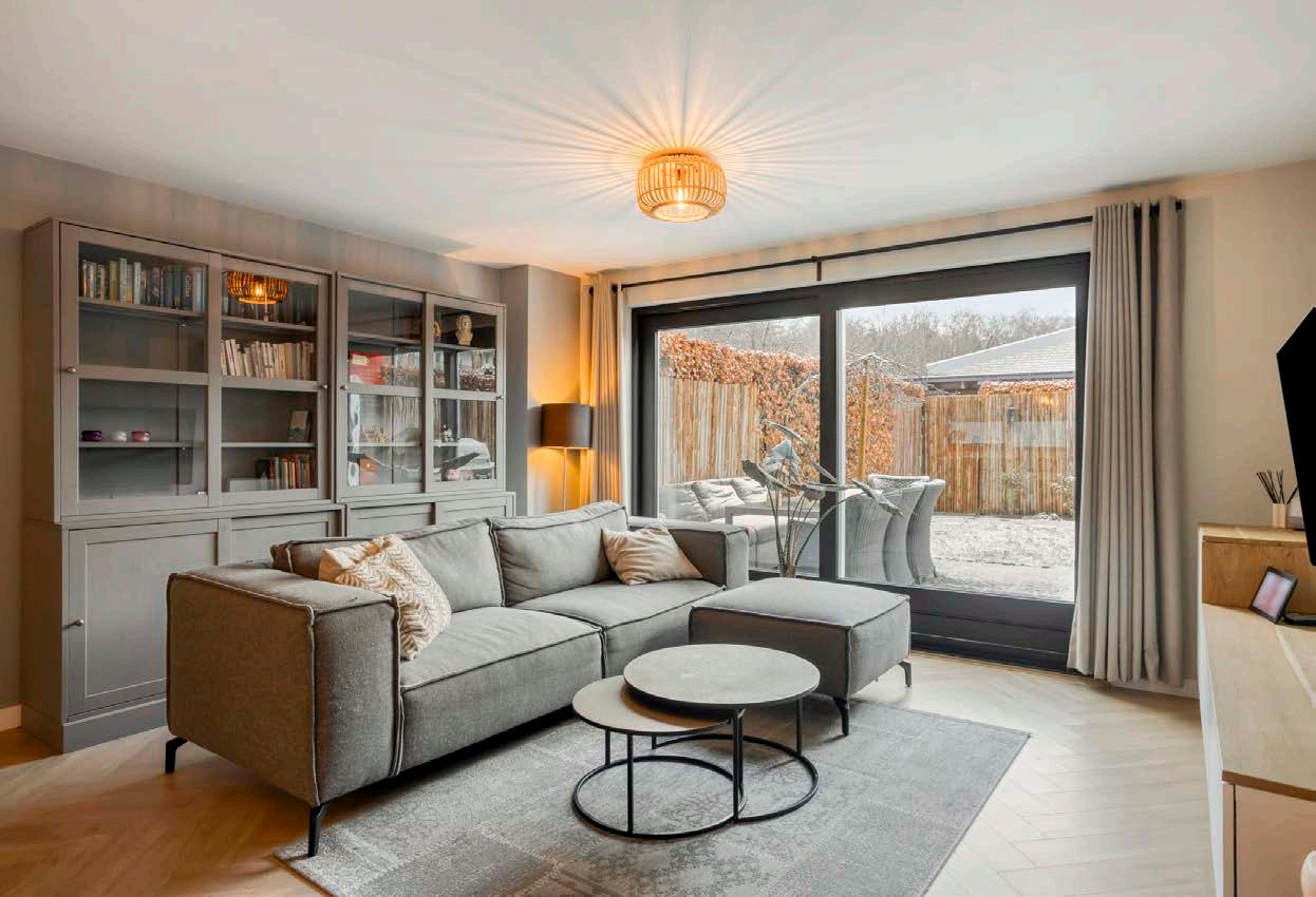 De woonkamer is voorzien van grote ramen, wat zorgt voor veel natuurlijk lichtinval. De schuifpui biedt directe toegang tot de diepe tuin, waardoor het een verlengstuk is van je leefruimte.