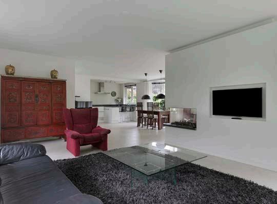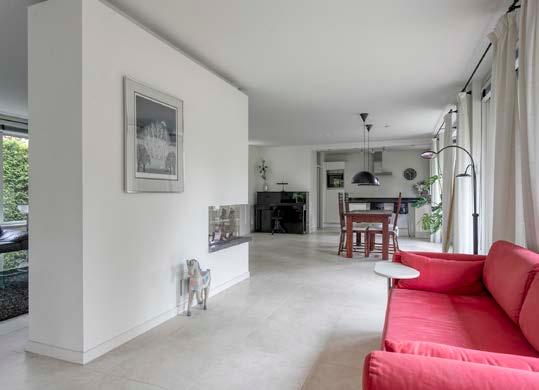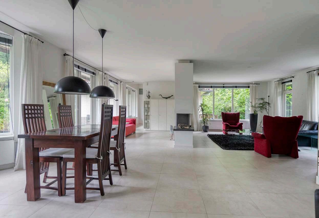 De woonkamer voelt direct als een fijn thuis. Het is een royale ruimte met grote raampartijen en dubbele openslaande deuren naar de tuin. Het natuurlijke licht vult de ruimte, wat het een open en ontspannen sfeer geeft. Wat deze plek écht bijzonder maakt, is de moderne gashaard. Een echte eyecatcher die sfeer en warmte toevoegt, perfect voor lange avonden met een goed boek of gezellige momenten met familie en vrienden. Aangrenzend bevindt zich de ruime eethoek, ideaal voor familiemaaltijden of het organiseren van een diner.