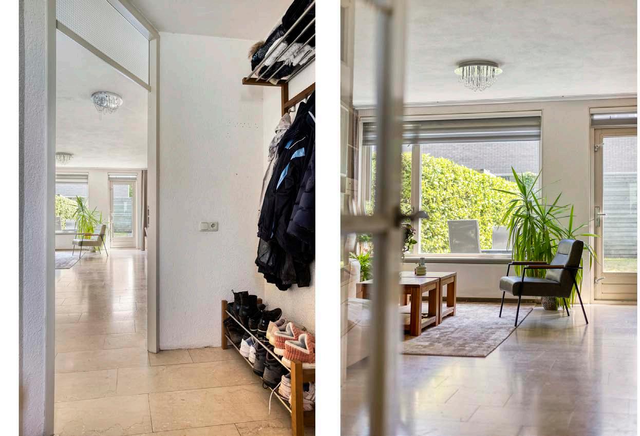 Bij aankomst word je verwelkomd in een ruime hal met toegang tot het toilet en de meterkast. Direct hierna betreed je de lichte en ruime woonkamer, gelegen aan de achterzijde van het huis. Dankzij de grote ramen op het zuiden geniet je hier de hele dag van veel lichtinval. De woonkamer heeft een praktische indeling en biedt meer dan genoeg ruimte voor een gezellige zit- en eethoek. De plavuizen vloer met vloerverwarming (bijverwarming) is niet alleen stijlvol, maar ook onderhoudsvriendelijk en duurzaam.
