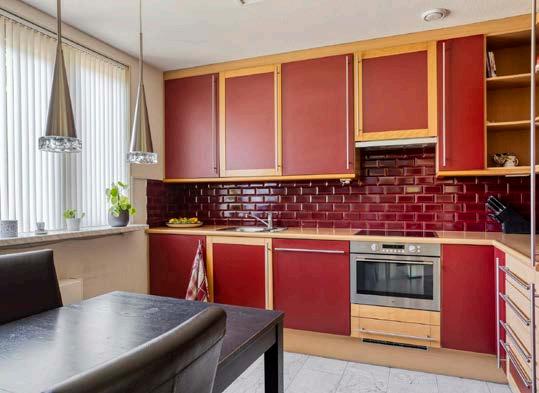 Aan de voorzijde van de woning bevindt zich de keuken. Hoewel de keuken iets gedateerd is, biedt dit een uitstekende mogelijkheid om het helemaal naar je eigen smaak te moderniseren. Dankzij de praktische indeling en de aanwezigheid van diverse inbouwapparatuur, zoals een inductie kookplaat, een combimagnetron, een koel-/ vriescombinatie en een afzuigkap, is dit een keuken met veel potentie. Met kleine aanpassingen, zoals het schilderen of wrappen van de frontjes, kun je deze ruimte snel omtoveren tot een moderne, stijlvolle plek.