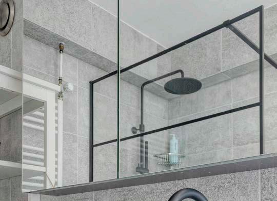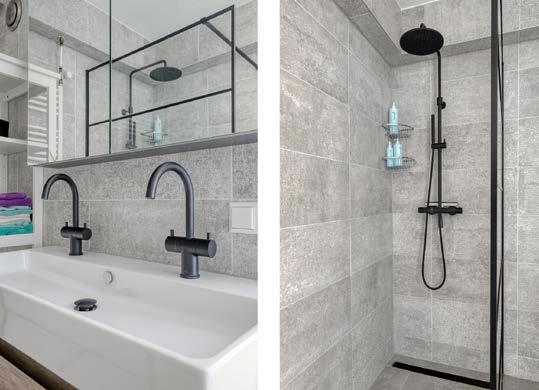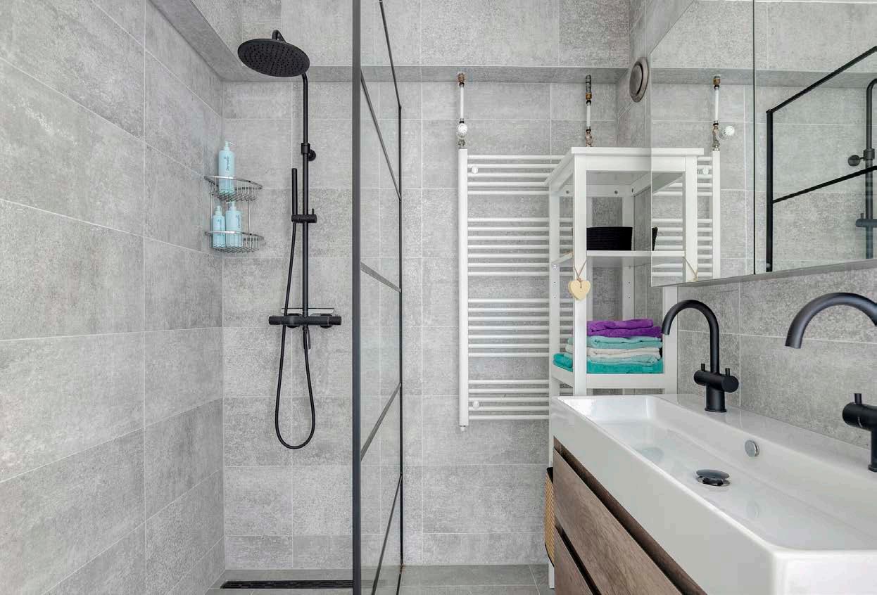 De luxe badkamer heeft een inloopdouche, dubbele wastafel en een wasmachineaansluiting.