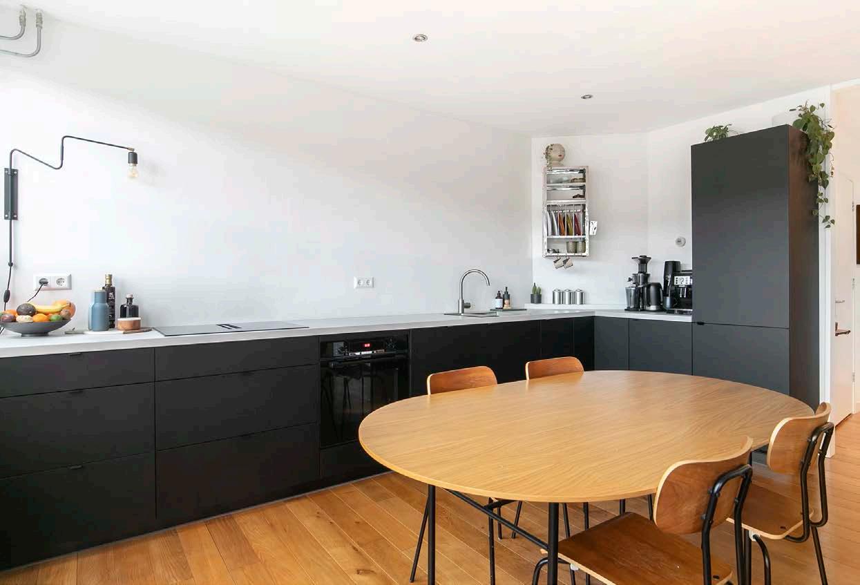Deze eethoek sluit vervolgens naadloos aan op de moderne open keuken (2021). De keuken is geplaatst in een L-opstelling en deze is uitgevoerd met strakke, matzwarte fronten. In de keuken beschikt u over voldoende kast- en werkruimte en daarnaast bent u hier voorzien van een inductiekookplaat met ingebouwd afzuigsysteem, oven, vaatwasser, koelkast en een vriezer.