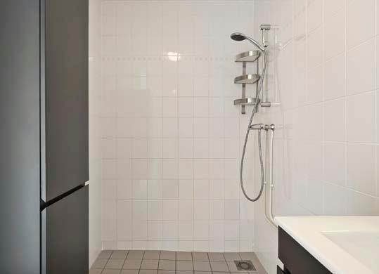 De badkamer is slim ingedeeld, netjes onderhouden en biedt alle basisvoorzieningen: een wastafelmeubel en een ruime douche.