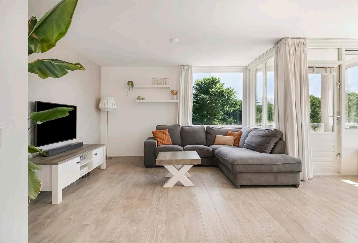 Allereerst het uitzicht: vrij en groen, met bomen en een park direct voor de deur. Geen inkijk, wel rust en ruimte. Het hoekappartement ligt op het zuiden. Hierdoor stroomt het licht de hele dag naar binnen, wat het huis een open en prettige sfeer geeft.