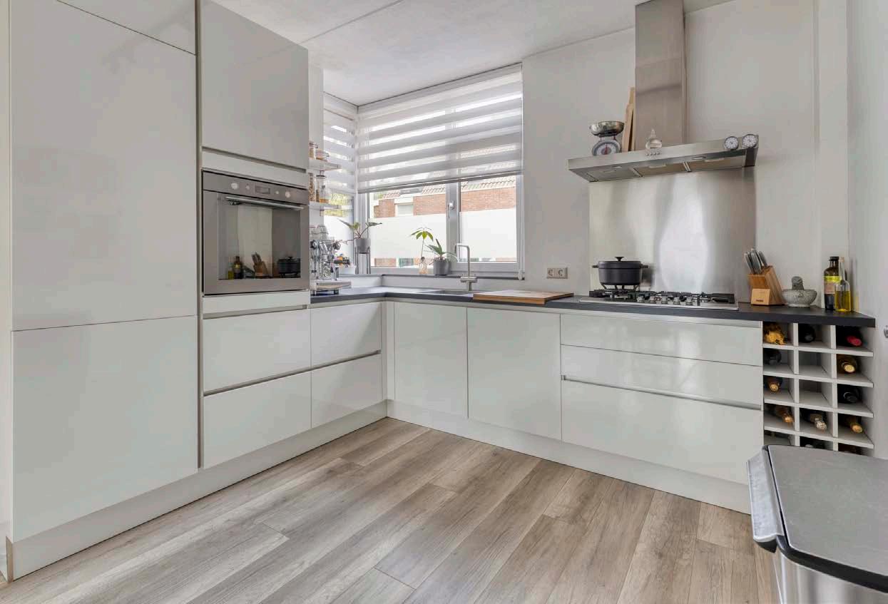 De keuken, helemaal up-to-date met strakke kasten en moderne apparatuur, vormt het hart van het huis. Of je nu een snelle maaltijd klaarmaakt of een uitgebreid diner plant, hier kun je je culinaire creativiteit de vrije loop laten.
