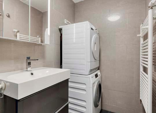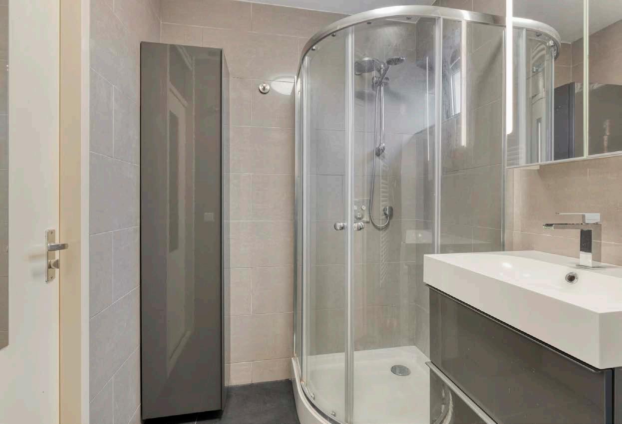 De keurig afgewerkte badkamer is voorzien van een douche en wastafelmeubel en tevens is er nog een separaat toilet aanwezig.