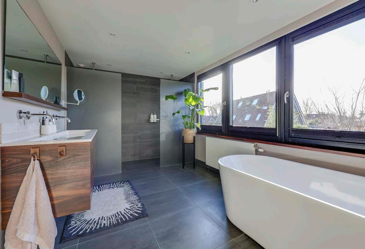 Op de bovenverdieping bevinden zich vier ruime slaapkamers en een luxe badkamer, allemaal tot in de puntjes afgewerkt. De masterbedroom is een heiligdom van comfort met een riante inloopkast, airconditioning, en openslaande deuren naar een Frans balkon. Een van de andere slaapkamers doet momenteel dienst als fitnessruimte, terwijl een andere is uitgerust met airco en dakramen en is gesplitst door een kastenwand, waardoor er ook daar een inloopkast ontstaat. De luxe badkamer is een ware eye-catcher; licht en stijlvol afgewerkt, biedt deze ruimte met twee regendouches, een vrijstaand ligbad, en een wastafelmeubel met dubbele wasbakken alle luxe die je je maar kunt wensen.