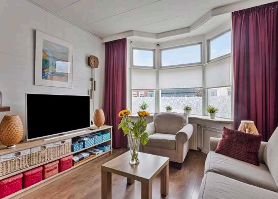 De woonkamer nodigt je uit om lekker te ontspannen, omringd door het warme licht dat binnenvalt door de grote ramen.