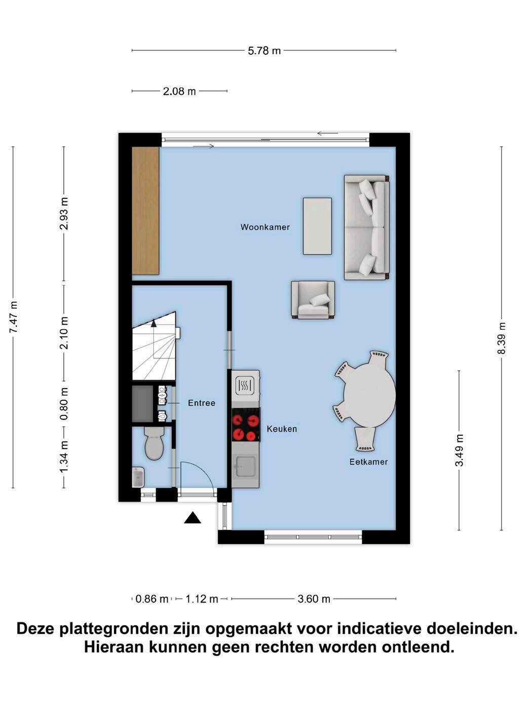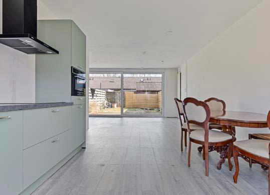 De woonkamer is een oase van licht dankzij de brede schuifpui die toegang biedt tot de zonnige achtertuin. Aan de voorzijde van de woning bevindt zich de keuken, terwijl het zitgedeelte aan de achterzijde is gesitueerd.