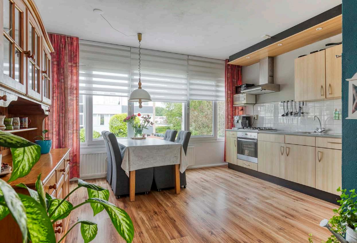 Grenzend aan de woonkamer ligt de keuken, praktisch ingedeeld met voldoende werk- en opbergruimte. Hier kun je eenvoudig een grote eettafel kwijt voor gezellige diners. De open opzet verbindt de keuken en woonkamer, wat het geheel ruimtelijk en sfeervol maakt.