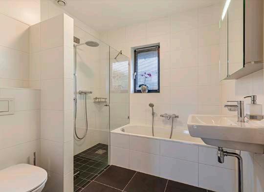 De goed uitgeruste badkamer heeft een ligbad, inloopdouche en moderne voorzieningen.