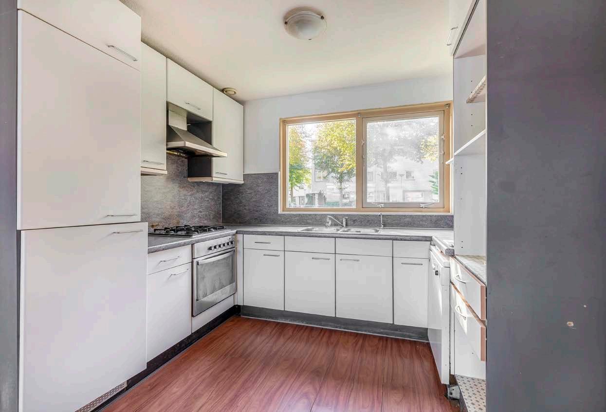 Aan de voorzijde van de woning een open keuken in U-opstelling. Uiteraard is het mogelijk om hier een nieuwe keuken te (laten) plaatsen die geheel aan jouw wensen voldoet. Stel je eens voor, een keuken in de opstelling, kleur en stijl die jij mooi vindt!