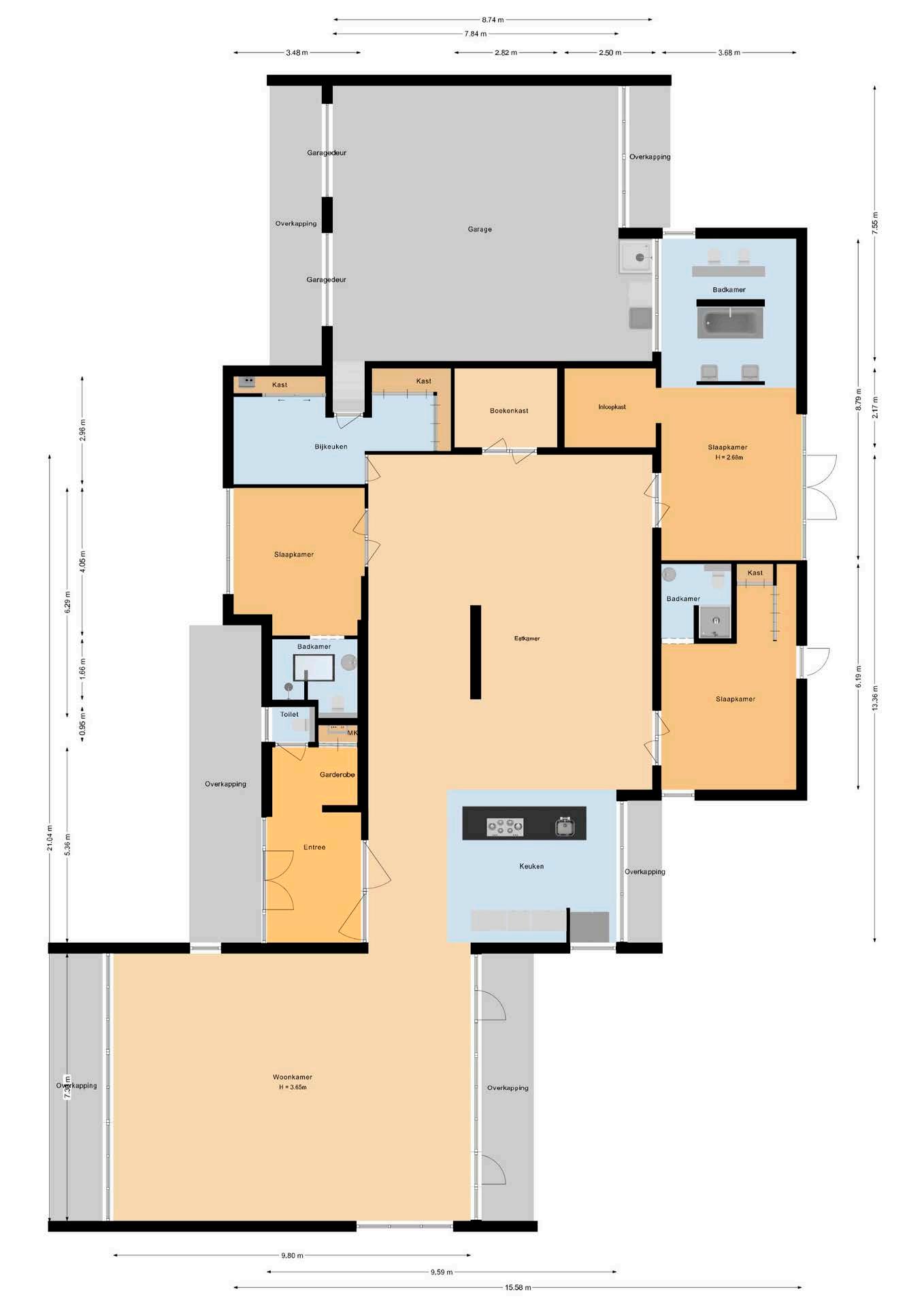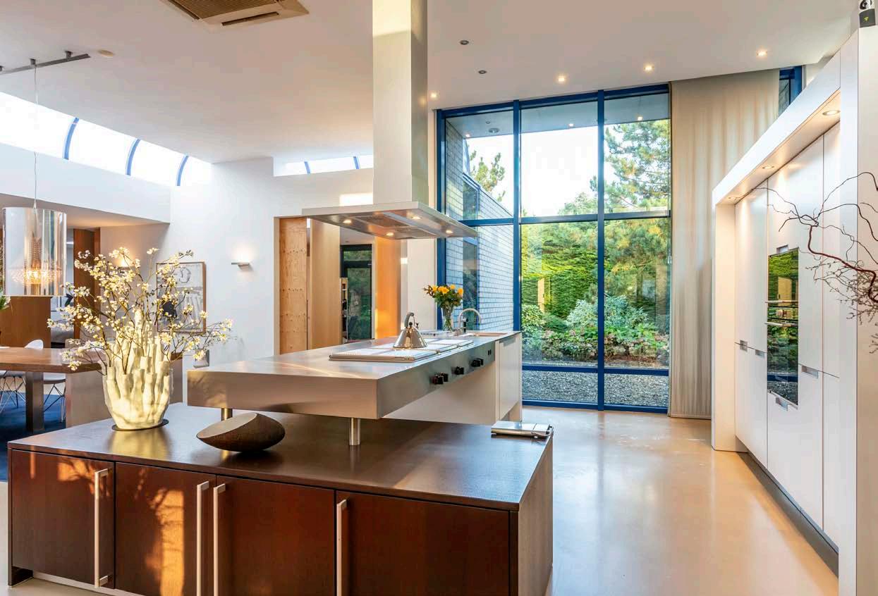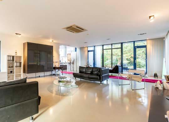Het hart van de woning bestaat uit een centrale leefruimte van 100m2 met een moderne open keuken incl. kookeiland, een vijf meter lange multifunctionele tafel en een plafondhoogte van 340 cm en een grote pui met een panoramisch uitzicht op de tuin. Verder een inloop bibliotheekkast.