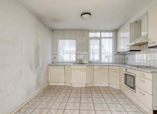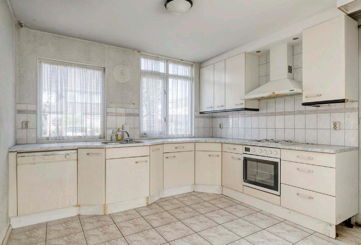 De keuken aan de straatkant is voorzien van inbouwapparatuur. Hoewel de keuken aan vervanging toe is, biedt deze ruimte zóveel potentieel. Denk aan een moderne open keuken met kookeiland, of juist een landelijke stijl met veel opberglades. Alles is hier mogelijk, dus de keuze is aan jou!