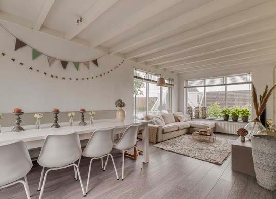 Een heerlijke woonkamer met fijne eethoek en openslaande deuren naar dakterras en veel lichtinval door de grote ramen.