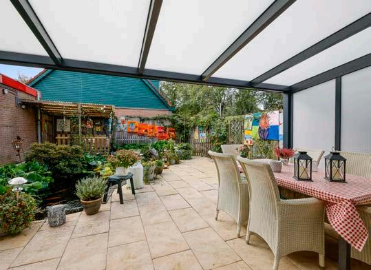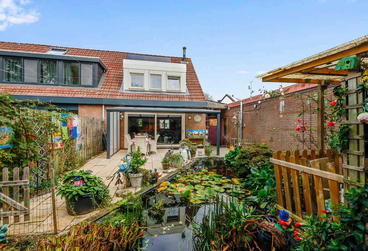 Via de grote schuifpui in de woonkamer loop je de zonnige achtertuin in. Het geheel bestaat uit bestrating, beplanting en een vijver. In deze fijne tuin kun je al vroeg in het voorjaar heerlijk buiten zitten en genieten van de zon. Als je nog een beetje in de schaduw wil zitten, biedt de serre een fijne plek. Vanuit hier heb je toegang tot de dubbele garage. Deze heeft een oppervlak van 34 m2 en is voorzien van elektra. Ideaal voor een ZZP’er.