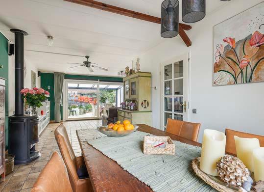 Vanuit hier lopen we de woonkamer binnen. Deze is tuingericht en lekker licht dankzij de grote kunststof schuifpui. Voor de sfeervolle avonden is er een houtkachel, hier kun je genieten van het knisperende haardvuur!