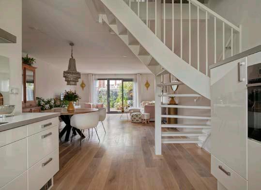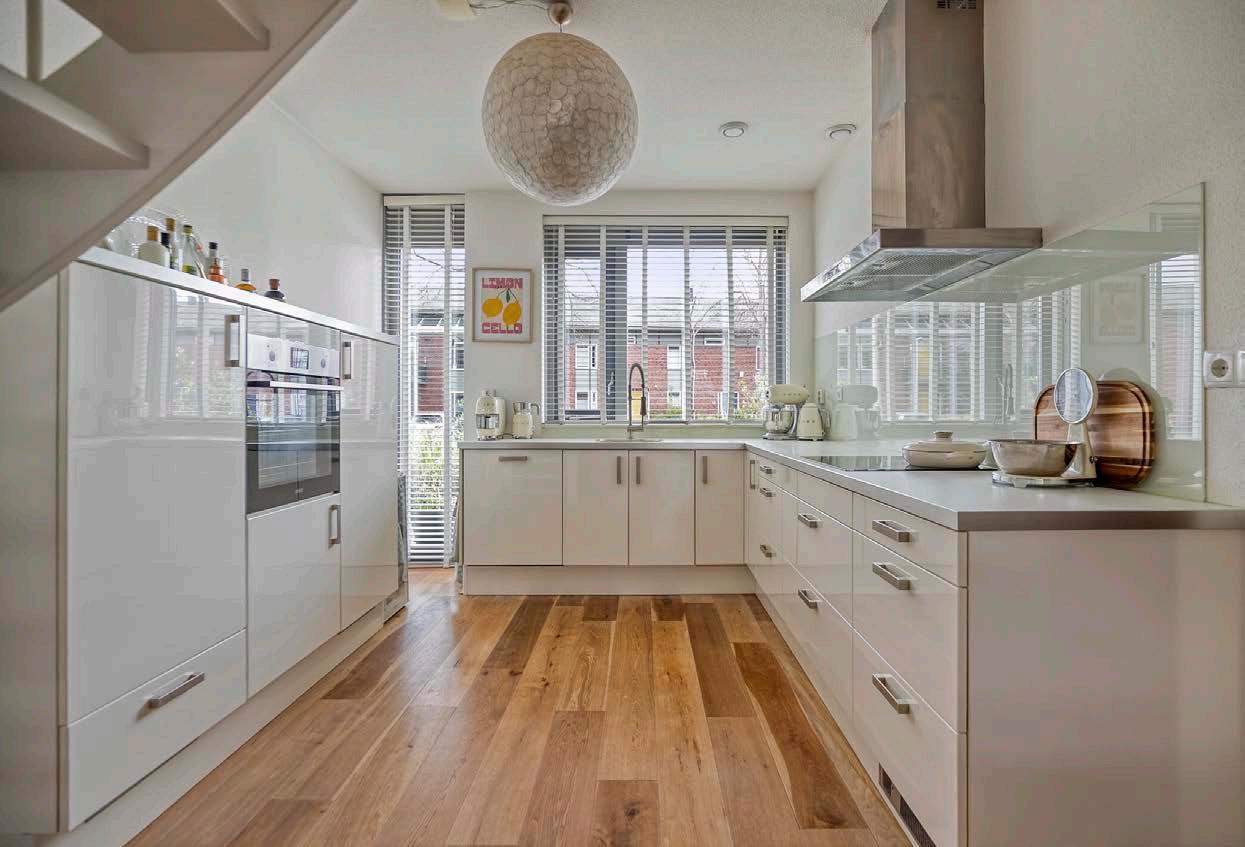 De open keuken is modern en praktisch ingericht met voldoende werk- en opbergruimte. Dankzij de mooie raampartijen is het een lichte en fijne plek om te koken en te genieten van het contact met de rest van het gezin.