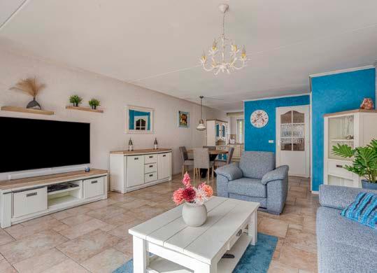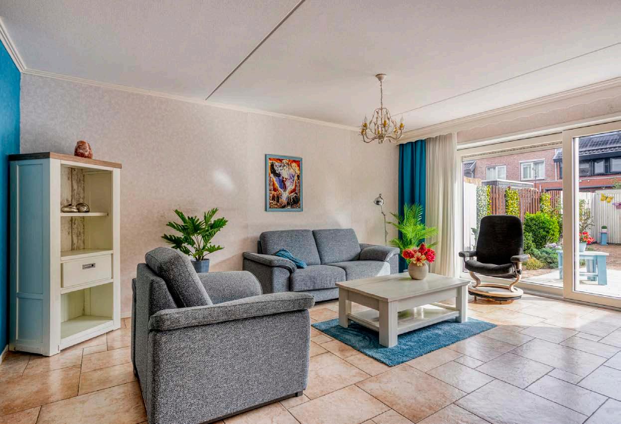 De lichte, uitgebouwde woonkamer is een fijne leefruimte. Dankzij de plavuizenvloer met vloerverwarming zit je hier het hele jaar behaaglijk. De schuifpui aan de achterzijde haalt de tuin naar binnen en in de praktische trapkast berg je moeiteloos alledaagse spullen op.