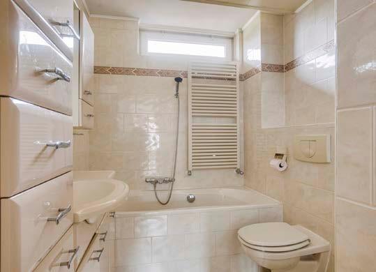 De badkamer is volledig betegeld en compleet uitgerust met toilet, douche, ligbad, wastafel en een radiator. Precies wat je nodig hebt voor een frisse start of een ontspannend einde van de dag.